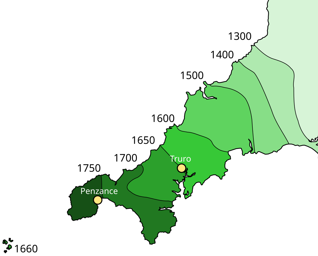 The other is the persistence of Cornish which, like its close relative across the sea in Wales, outlived the Middle Ages. Gradually, though, English encroached further and further west. Here’s a suspiciously neat map: