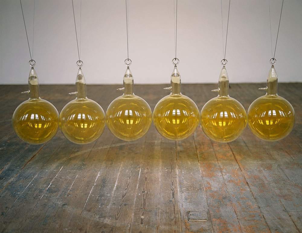 A few weeks ago, I saw a piece of art I have been unable to stop thinking about since. Hamad Butt’s Cradle consists of a giant, immobilised Newton’s Cradle, a sort of executive desk toy popular in the ‘80s. In this version, though, it’s not five metal spheres that are hung in a line, so that a force at one end of the line causes the sphere at the other to move: its sealed glass baubles, each filled with lethal yellow chlorine gas. All the time I was in the room containing the work and looking at its companion pieces, Hypostasis and Ladder – the three make up a 1992 trilogy called Familiars – I was constantly aware of Cradle, and the low but constant itch to abandon my caution and all good sense and set it into motion.