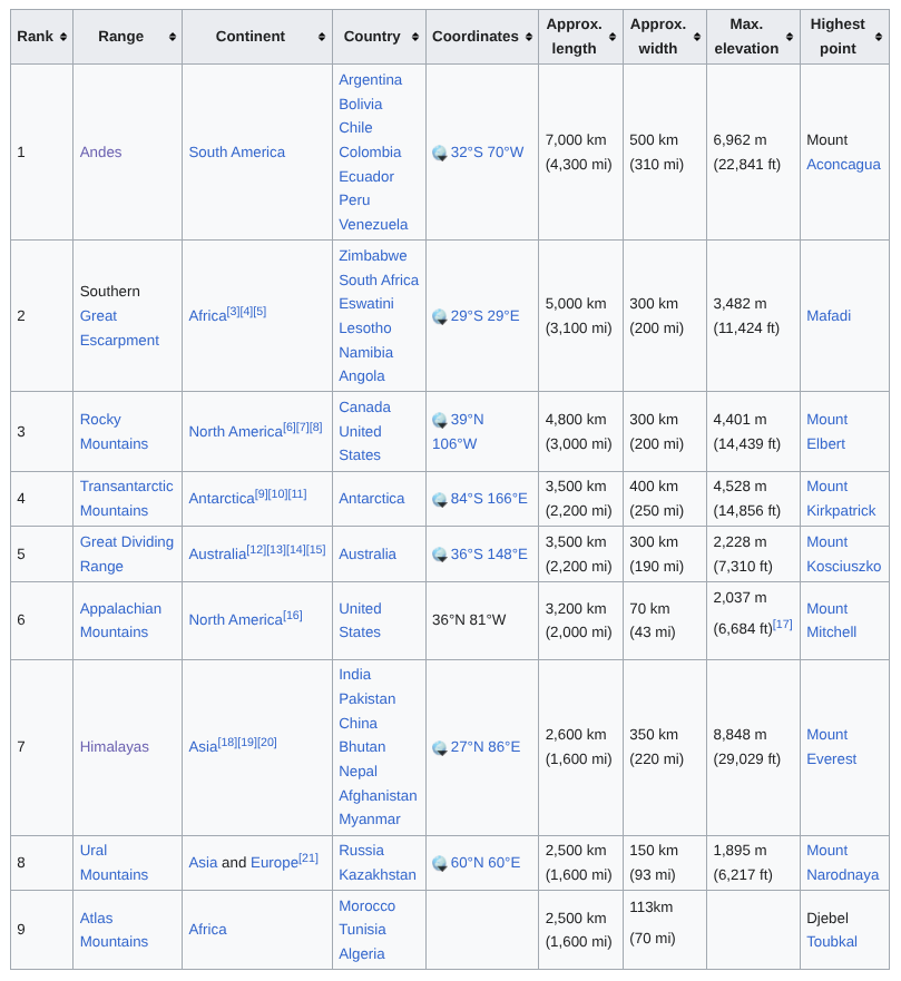 Wikipedia, as so often, has a helpful chart – which, for reasons I am not entirely clear on, contains the top nine. On that, the Himalayas are all the way down in seventh place, beneath the Rockies and Appalachians, plus a few ranges I was barely even aware of. (In one case, to be fair, it’s because they’re hiding under quite a lot of snow.)3